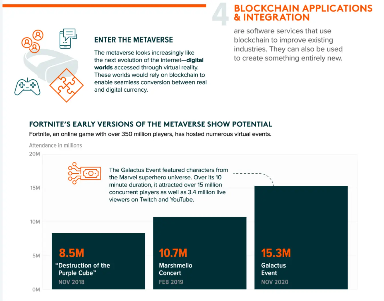 •The Metaverse: Ambitious projects are underway to build persistent, shared virtual worlds where users can work, socialize, and play. These metaverses will require their own digital economies, a role that blockchain is uniquely suited to fill. Tech giants like Meta (formerly Facebook) are investing billions annually in this vision 1.