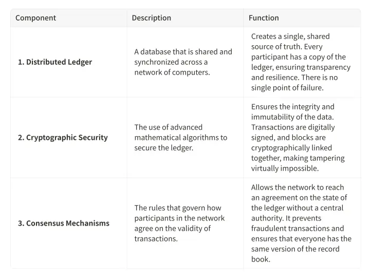 To understand how blockchain creates trust, it is essential to understand its three core components: the distributed ledger, cryptographic security, and consensus mechanisms.