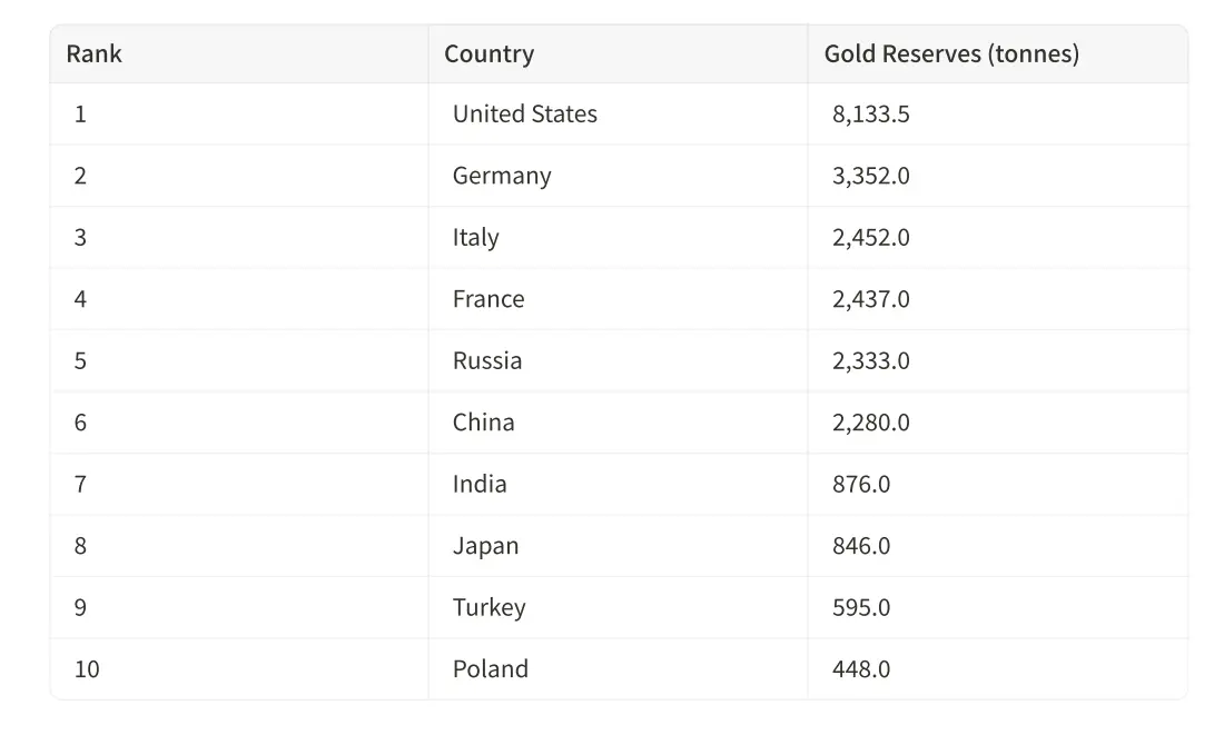 European nations also maintain a strong presence at the top of the gold-holding hierarchy. Germany, Italy, and France collectively hold nearly 8,200 tonnes of gold, a legacy of the post-World War II Bretton Woods agreement, which established a gold-backed international monetary system. The following table illustrates the top 10 countries by their official gold reserves as of 2024: