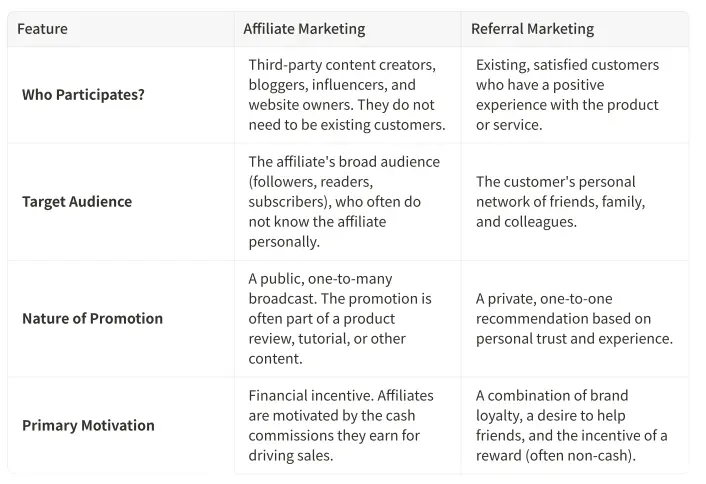 The main difference lies in who is doing the promoting and the nature of their relationship with the potential customer. Affiliate marketing uses third-party content creators (bloggers, influencers) who promote products to their broad audience, often people they don't know personally. Referral marketing activates existing customers who recommend products to their friends and family based on personal experience and trust. Affiliates are primarily motivated by cash commissions, while referral participants are motivated by a combination of loyalty, helping friends, and earning rewards.